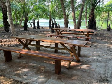 Áreas bajo techo con mesas y bancos para servirse comidas y refrigerios y reunirse en familia y/o amigos.